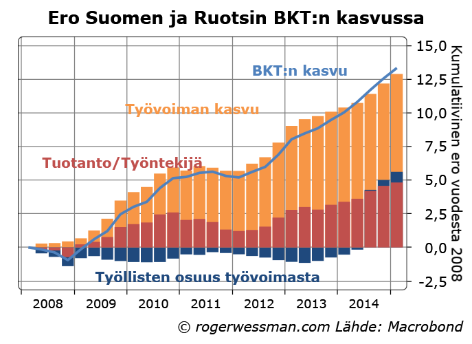 Kirjoitin sanan ”selittää” lainausmerkkeihin, koska tämä tarkastelu vain kirjanpidollisessa mielessä jakaa BKT:n kasvua osiin. Se ei kerro välttämättä syy-yhteydestä. Jos esimerkiksi työllisyyden kasvu olisi ollut ripeämpää Suomessa, ero BKT:n kasvussa ei välttämättä olisi ollut vastaavasti pienempi. On myös mahdollista, jopa tässä taloustilanteessa todennäköistä, että työttömyys olisi silloin ollut Suomessa korkeampi.