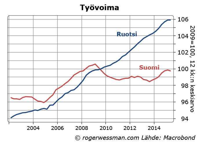 Työvoiman kasvu on Ruotsissa ollut ripeämpää kuin Suomessa viime vuosina, kun suurten ikäluokkien eläköityminen on vaikuttanut Suomeen paljon voimakkaammin kun Ruotsissa. Sodan jälkeiset ikäluokat olivat suurempia Suomessa kun sodan ulkopuolella olleessa Ruotsissa, ja jatkuva merkittävä maahanmuuton on tervehdyttänyt Ruotsin ikärakennetta. Suomi ja Ruotsi työvoiman kehitys Kuinka suuren osan erosta Suomen ja Ruotsin kasvussa tämä selittää? Voidaan karkeasti jakaa eroa BKT:n kasvussa kolmeen perustekijään: tuotantoon per työntekijä (≈tuottavuus), työllisten osuuteen työvoimasta sekä työvoiman kasvuun. Tästä havainnollisesti näkee että työvoiman kasvu ”selittää” yli puolet erosta talouden kasvussa, ja tuottavuus hiukan tätä vähemmän.