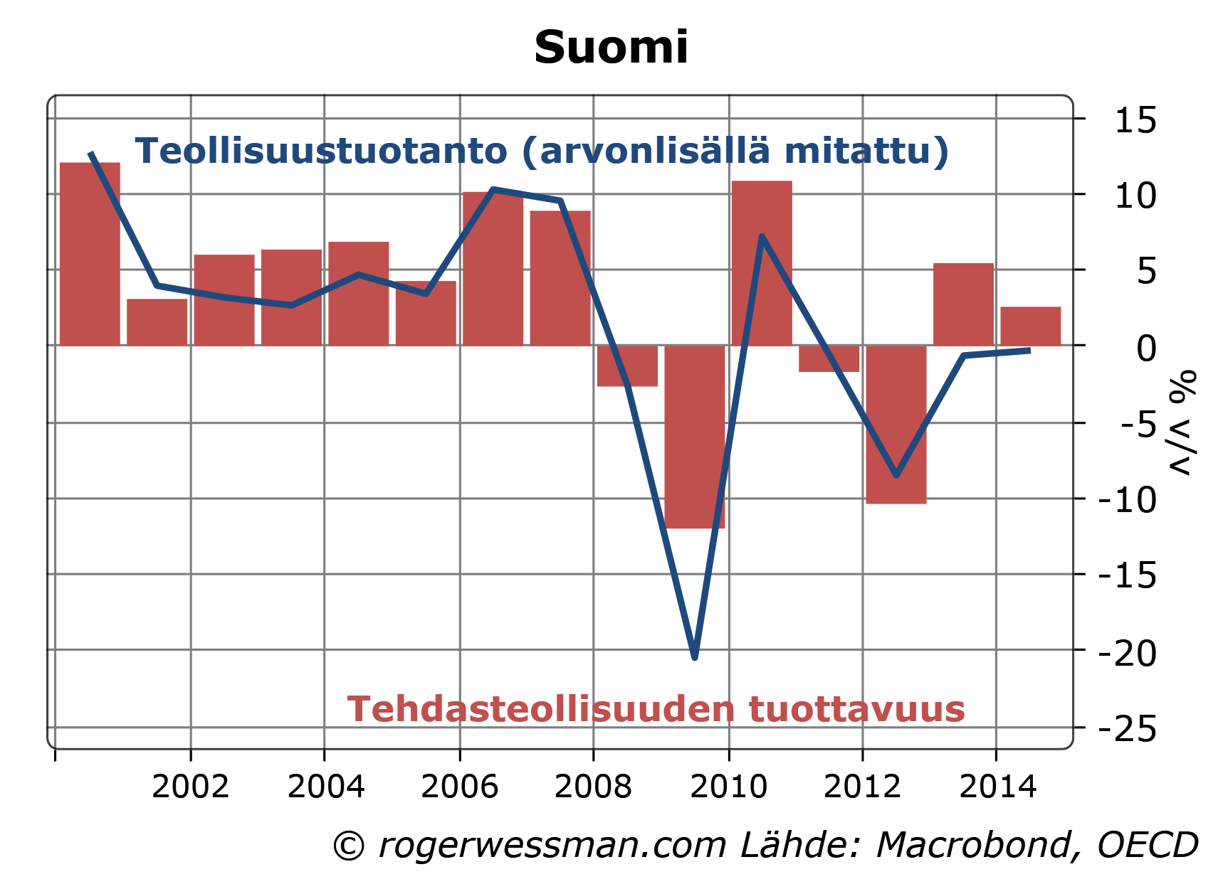 Tuottavuus laski jyrkästi 2009 ja 2012 kun jyrkät taantumat painoivat tuotantoa alaspäin. Kun hiljalleen työvoimaa on sopeutettu alhaisemman tuotannon mukaisesti, tuottavuusluvut ovat toipuneet. Edelleen kuitenkin teollisuuden tuottavuus on alhaisemmalla tasolla kuin vuonna 2011. Mitään tuottavuushyppyä ei ole tapahtunut.