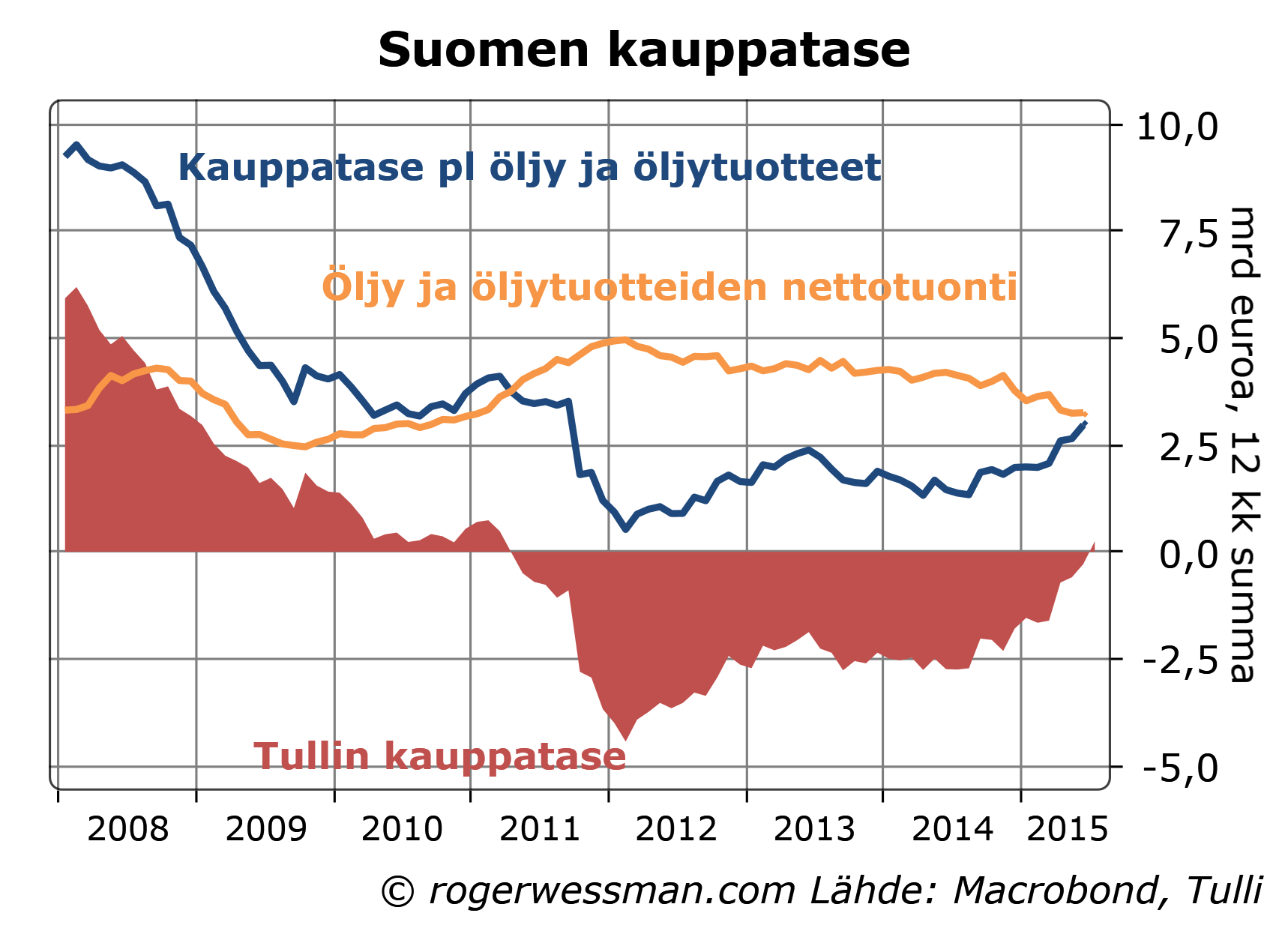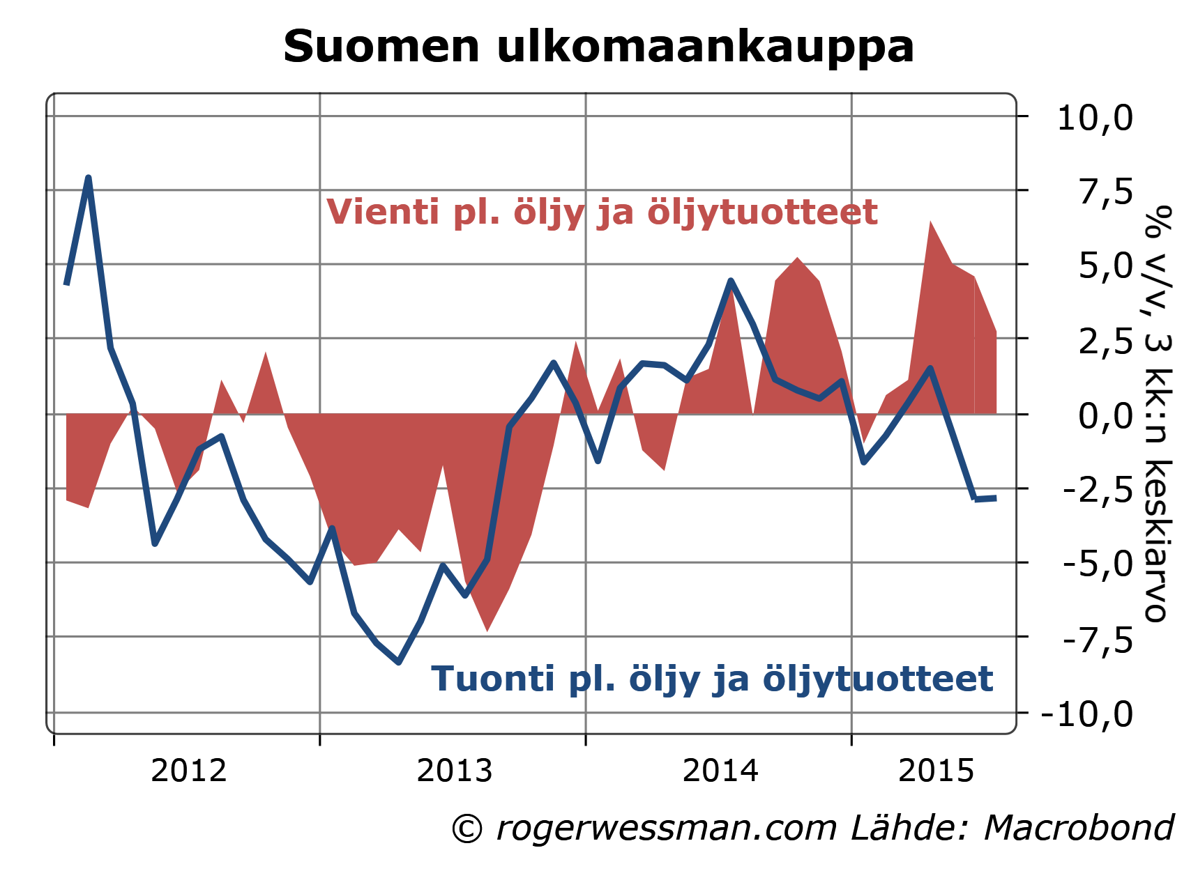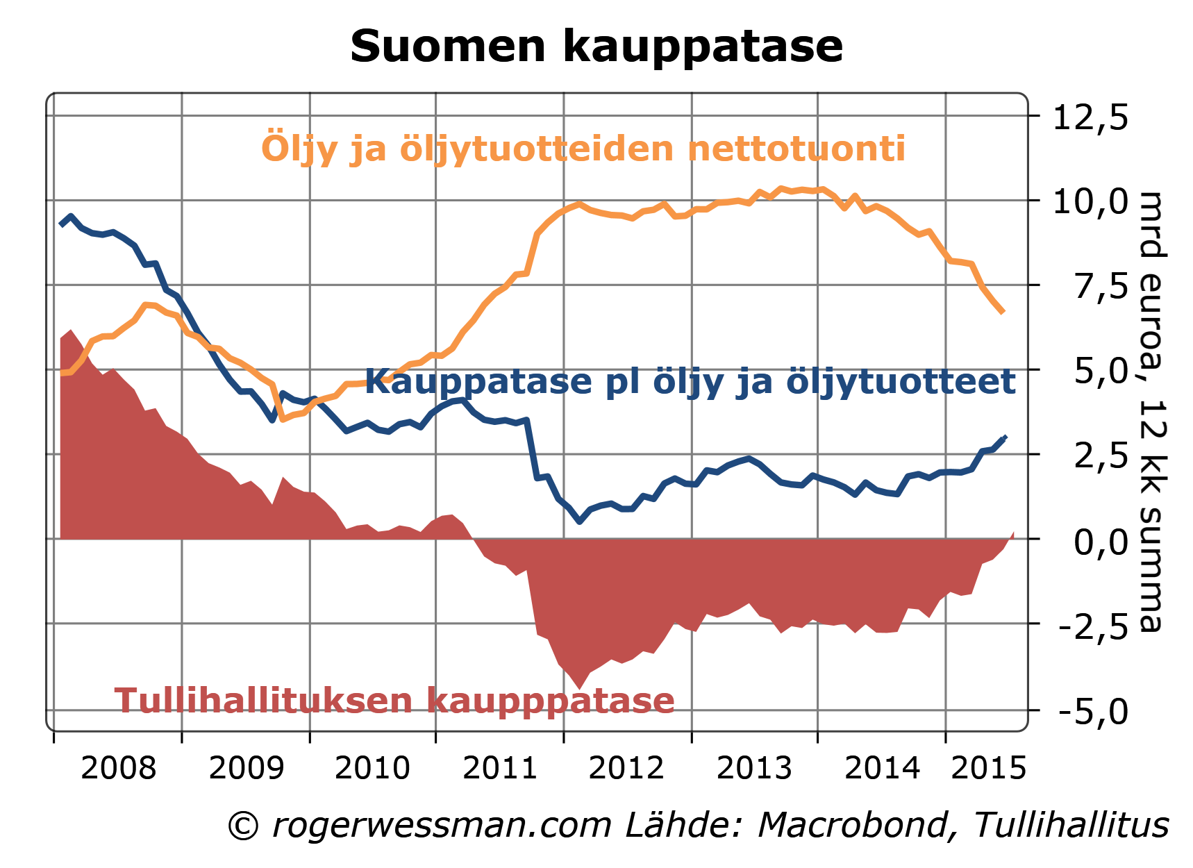 Tullin ulkomaankauppaluvut kertovat Suomen ulkomaankaupan tasapainon ripeästi parantuneen vaikka vienti on polkenut paikallaan koska tuonti on rajusti supistunut. Luvut antavat kuitenkin liian synkän kuvan kehityksestä. Sekä vienti- että tuontilukuja on painanut öljyn hinnan romahdus. Puhdistettuna tästä vientiluvut näyttävät, Venäjä-viennin romahduksesta huolimatta, pientä kasvua viimeisen vuoden aikana.