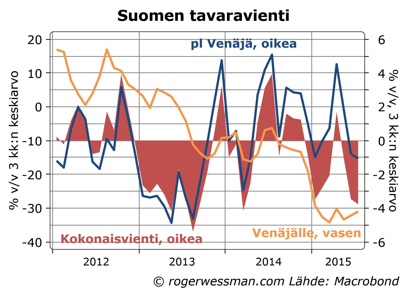 Viennin kasvu on varovaisen rohkaisevia etenkin kun tiedämme, että merkittävänä jarruttavana tekijänä on lisäksi ollut Venäjä-viennin yli kolmenkymmenen prosentin romahdus. Tämä on alkuvuonna leikannut yli kaksi prosenttiyksikköä viennin kasvusta. Euroalueen orastava toipuminen on kuitenkin näkynyt kasvavana vientinä muihin euromaihin.