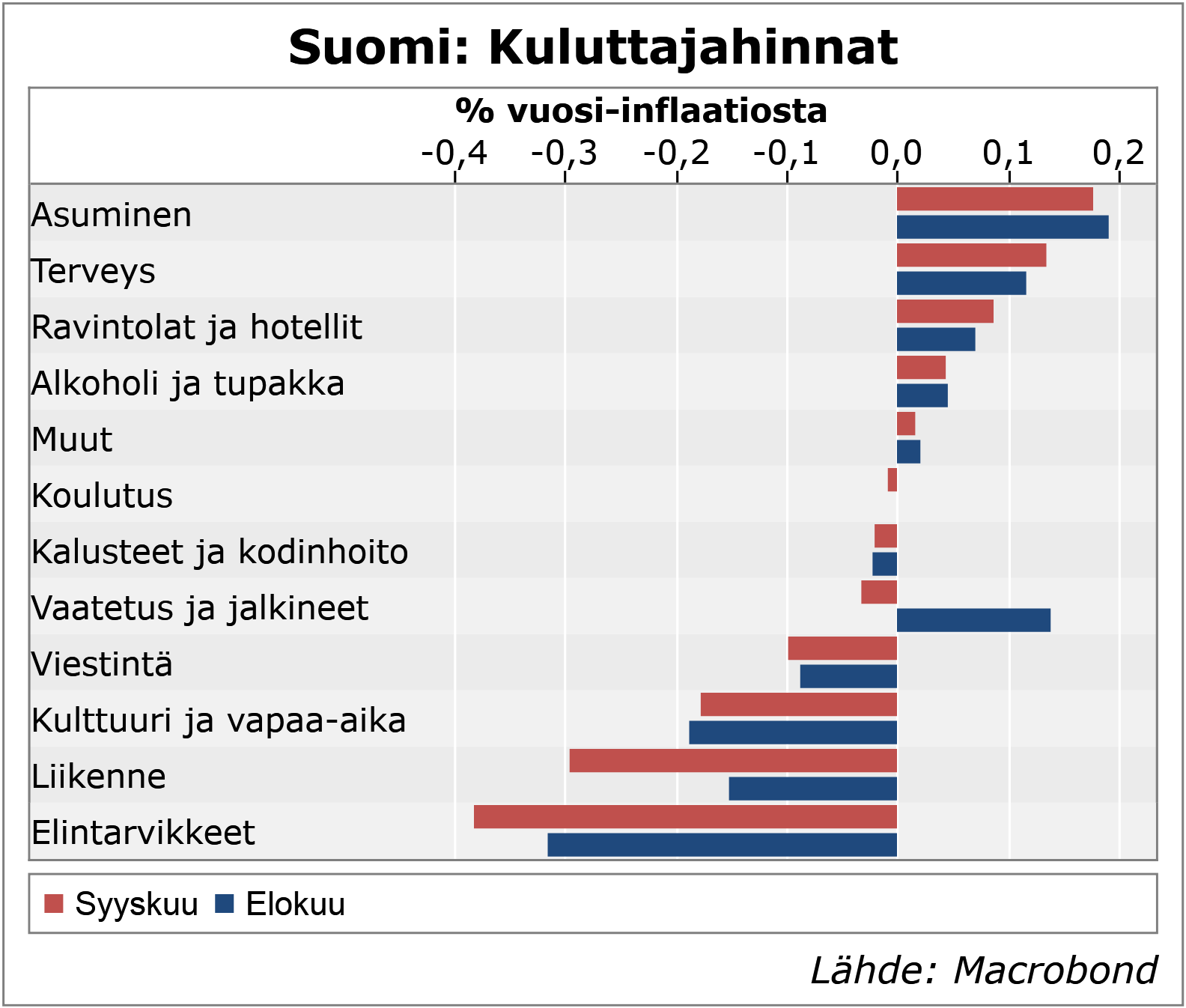Deflaation kiihtyminen syyskuussa selittyy lähinnä kahdella tekijällä. Polttoaneiden hintojen kiihtyneellä laskulla, joka heijastuu erityisesti liikenteen ja asumisen kustannuksiin, sekä vaatteiden hintojen nousun hyytymisellä. Lisäksi elintarvikkeiden hintojen lasku hivenen nopeutui. Muissa ryhmissä ei suuria muutoksia nähty, mutta kautta linjan inflaatio on varsin vaimeata.