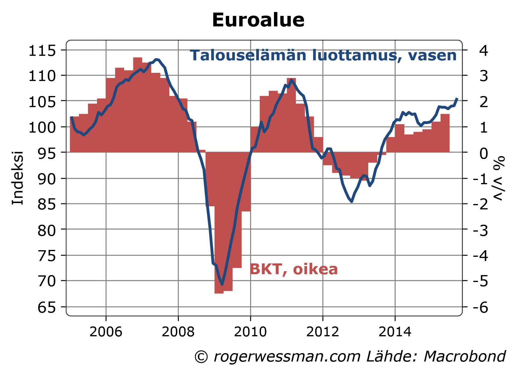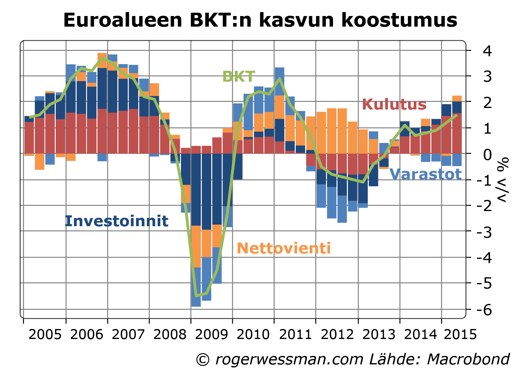 Euroalueen talouskasvu on kiihtynyt, eikä tämä suinkaan ole johtunut ainoastaan viennin vedosta. Sekä kulutuksen että investointien kasvu on vahvistunut. Yksinään ne ovat viimeisen vuoden aikana nostaneet euroalueen BKT:ta parilla prosenttiyksiköllä. Jarruna on ollut heikko varastokehitys, mikä on lupavaa talouden jatkuvaa kasvua ajatellen.