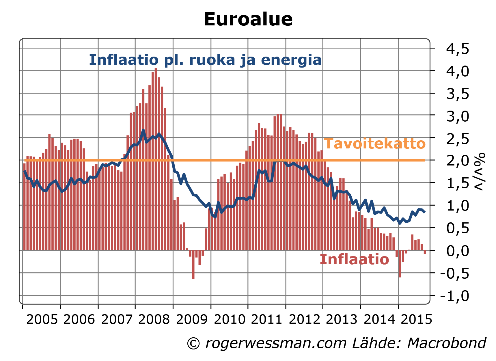 On toki mahdotonta varmuudella sanoa miltä osin piristyminen johtuu EKP:n toimista ja miltä osin esimerkiksi öljyn hinnan laskusta tai siitä, ettei finanssipolitiikka enää olla kiristetty yhtä paljon kuin edeltävinä vuosina. Yhtä kaikki talousluvut ovat kehittyneet juuri sillä tavalla kun mitä oltaisiin odotettu, jos EKP:n toimilla olisi ollut vaikutusta.