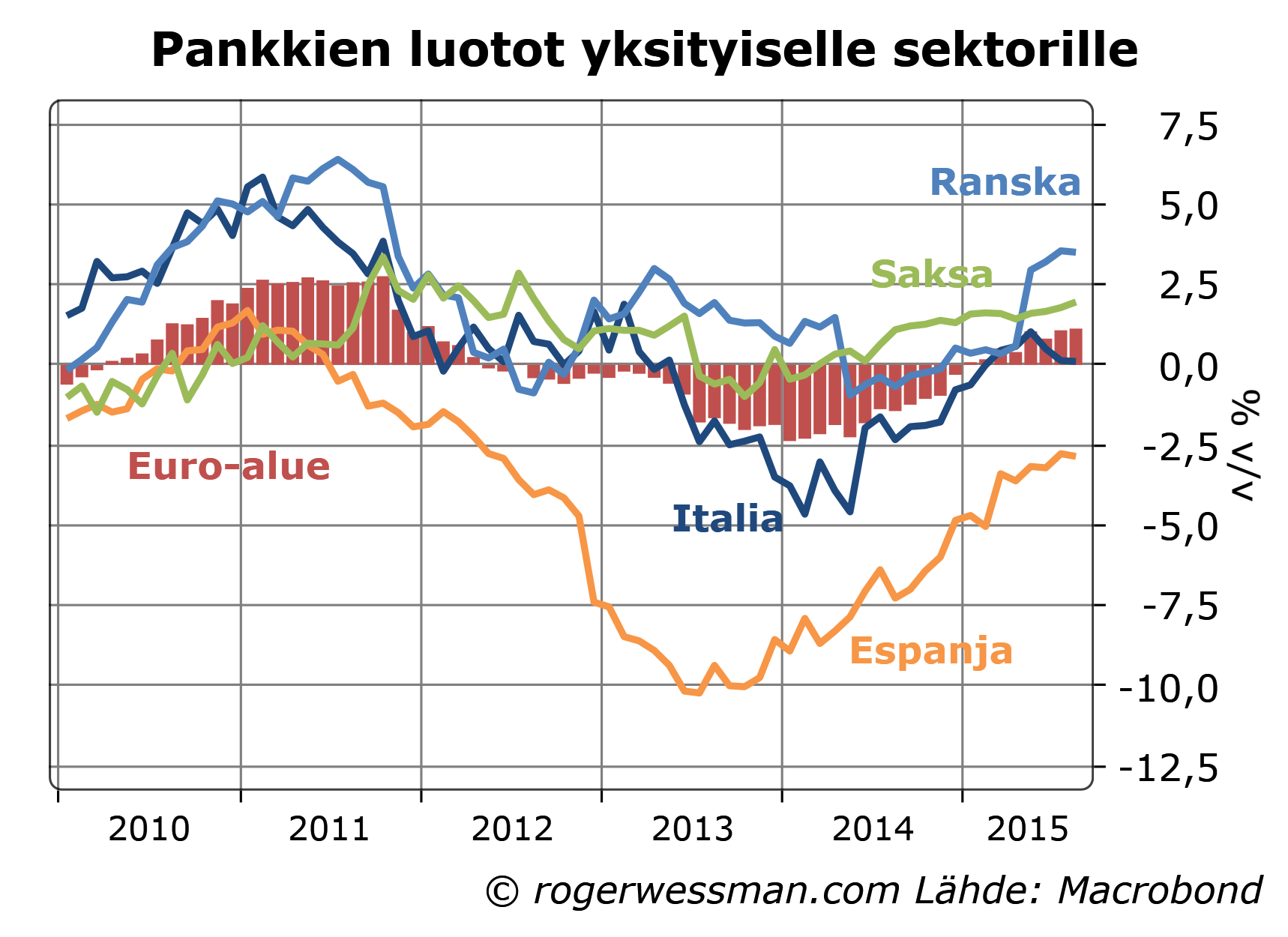 Vastoin monien epäilyjä siitä ettei ”narulla voi työntää”, luotonanto on hivenen piristynyt sen jälkeen kun EKP viime vuoden keväällä aloitti rahapolitiikan keventämisen pitkä-aikaisilla lainaoperaatioilla pankeille. Euroalueen pankkien luotokanta on tänä vuonna kääntynyt kasvuun. Espanjassa toki edelleen luottokanta on laskenut, mutta laskun hidastuminen jo tarkoittaa, että enemmän rahaa jää velanhoidon jälkeen kulutukseen ja investointeihin.