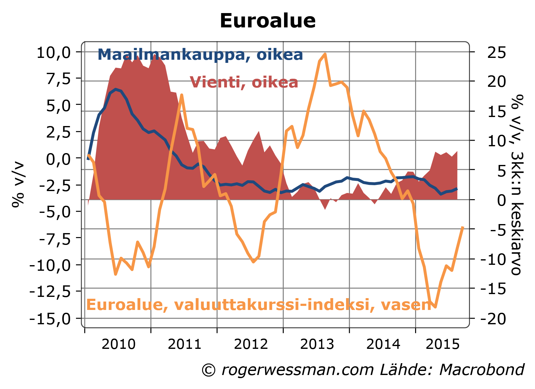 Euroalueen vientitulojen kasvu on tänä vuonna kiihtynyt vaikka maailmankaupan kasvu onkin hidastunut. Tätä on tietysti edesauttanut, että EKP on toimillaan auttanut heikentämään euroa muita valuuttoja vastaan. Euroalueen vienti on kasvanut viime neljänneksinä maailmankauppaa vahvemmin. Tätä ei ole nähty sitten vuoden 2012, jolloin euro myös oli heikentynyt.