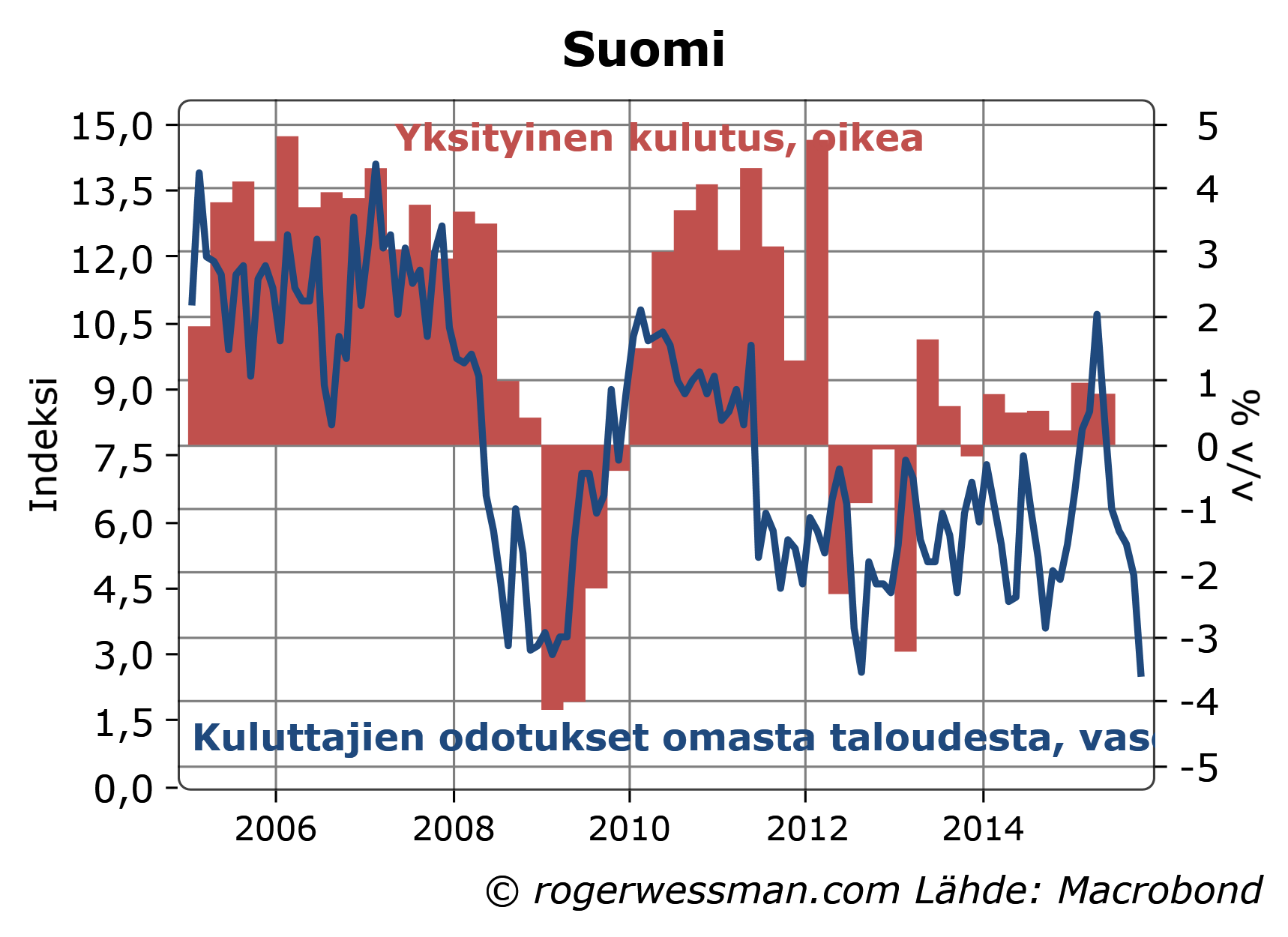 Kuluttajien horjuva luottamus omaan talouteen on tietysti huono uutinen kulutuksen kannalta. Tämän perusteella on kuitenkin hätiköityä vetää johtopäätöstä että ”taantuma on siirtymässä kotimarkkinoille”, kuten esimerkiksi Hypoteekkiyhdistyksen Juhana Brotherus toteaa Taloussanomissa. Viimeisten vuosien aikana tämä indikaattori on pyörinyt useamman kerran lähellä näitä tasoja, eivätkä heilahtelut ole kovin luotettavasti ennakoinut käänteitä kulutuksessa.