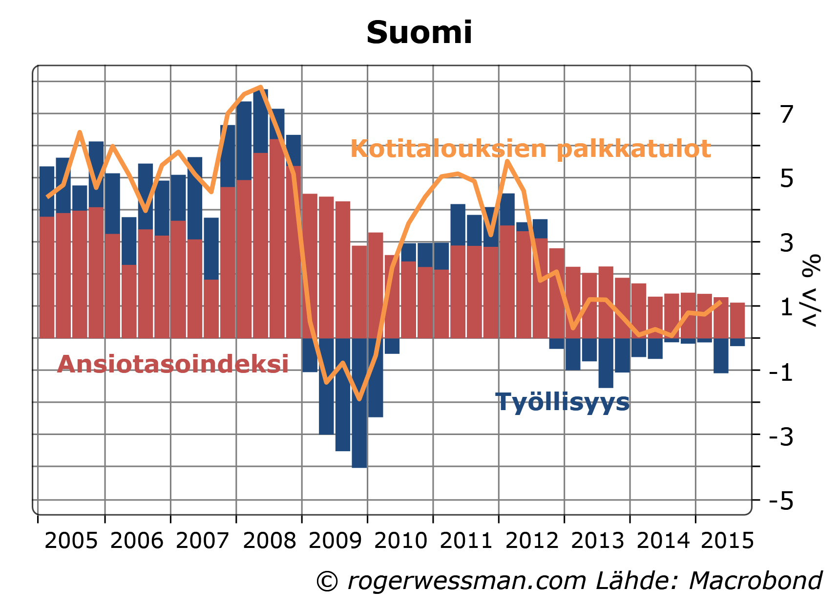 Työllisyyden kehitys on ollut selkeästi tärkeämpi palkkatuloja heilauttava tekijä kuin palkkojen nousu, joka on verkkaisesti hidastunut viime vuosina. Työllisyyden laskun myötä palkkatulot esimerkiksi supistuivat 2009, vaikka palkat nousivat kohtuullisesti työpaikkansa säilyttäneillä. Palkkatulojen kasvu on vastaavasti viimeisen vuoden aikana kiihtynyt, kuin työllisyyden lasku on taittunut.