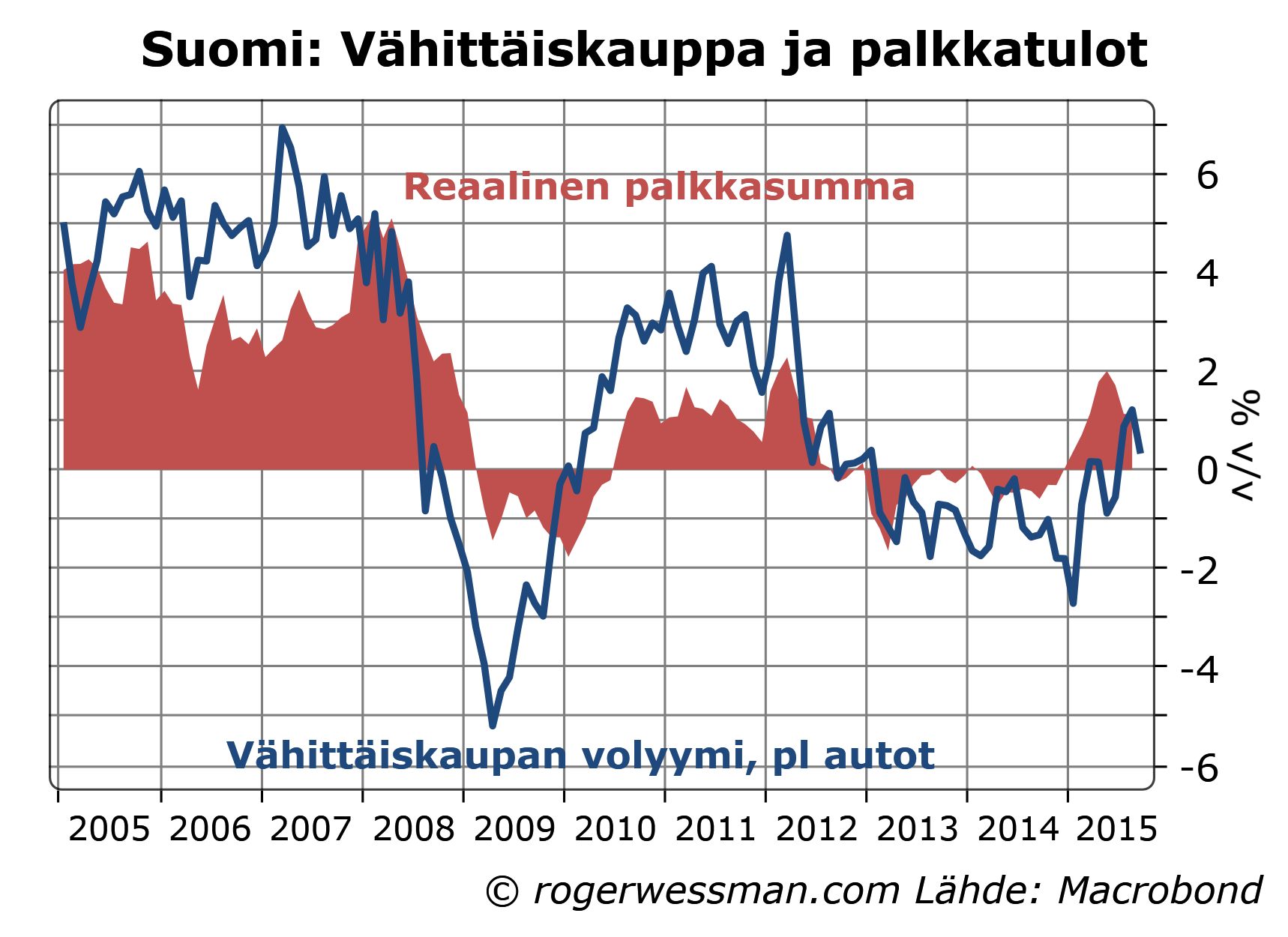 Vähittäiskauppa on tukenut se, että reaaliset palkkatulot ovat palkkojen nousun hidastumisesta huolimatta kääntyneet tänä vuonna nousuun. Tärkeä syy tähän on tietysti kuluttajahintojen lasku joka on nostanut kuluttajien ostovoimaa. Nimellisestikin palkkasumman kasvu on kiihtynyt, koska työllisyyden heikkeneminen on hidastunut.
