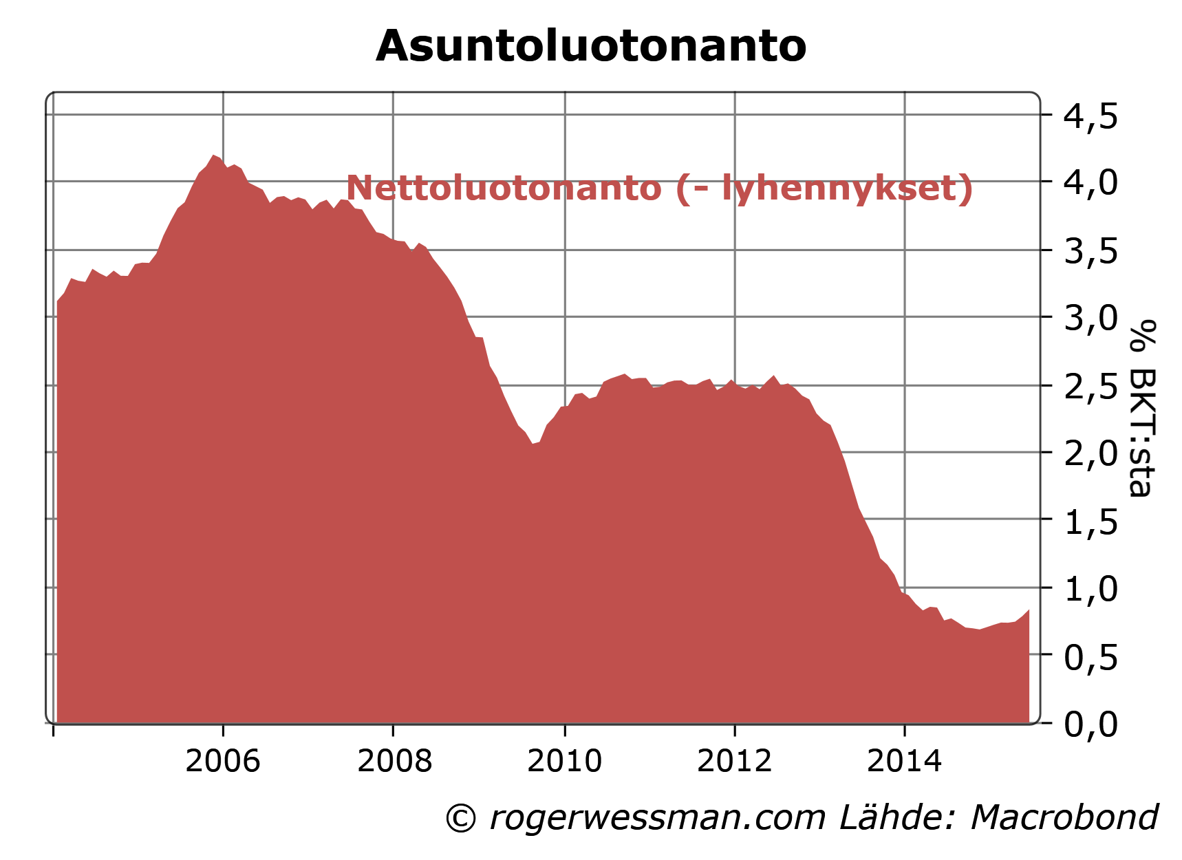 Suomessa ei kuitenkaan viime vuosina asuntolainoilla olla keinotekoisesti merkittävissä määrin pönkitetty talouden kysyntää ja nostettu tulotasoa. Asuntoluottokannan kasvu on päinvastoin lähes täysin tyrehtynyt, joskin tänä vuonna on nähty pientä piristymistä.