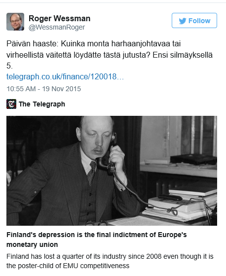 Haastoin eilen Twitterissä etsimään virheellisiä tai harhaanjohtavia väitteitä Daily Telegraphin sensaatiohakuisista jutuistaan tunnetun Ambrose Evans-Pritchardin Suomi-artikkelista.