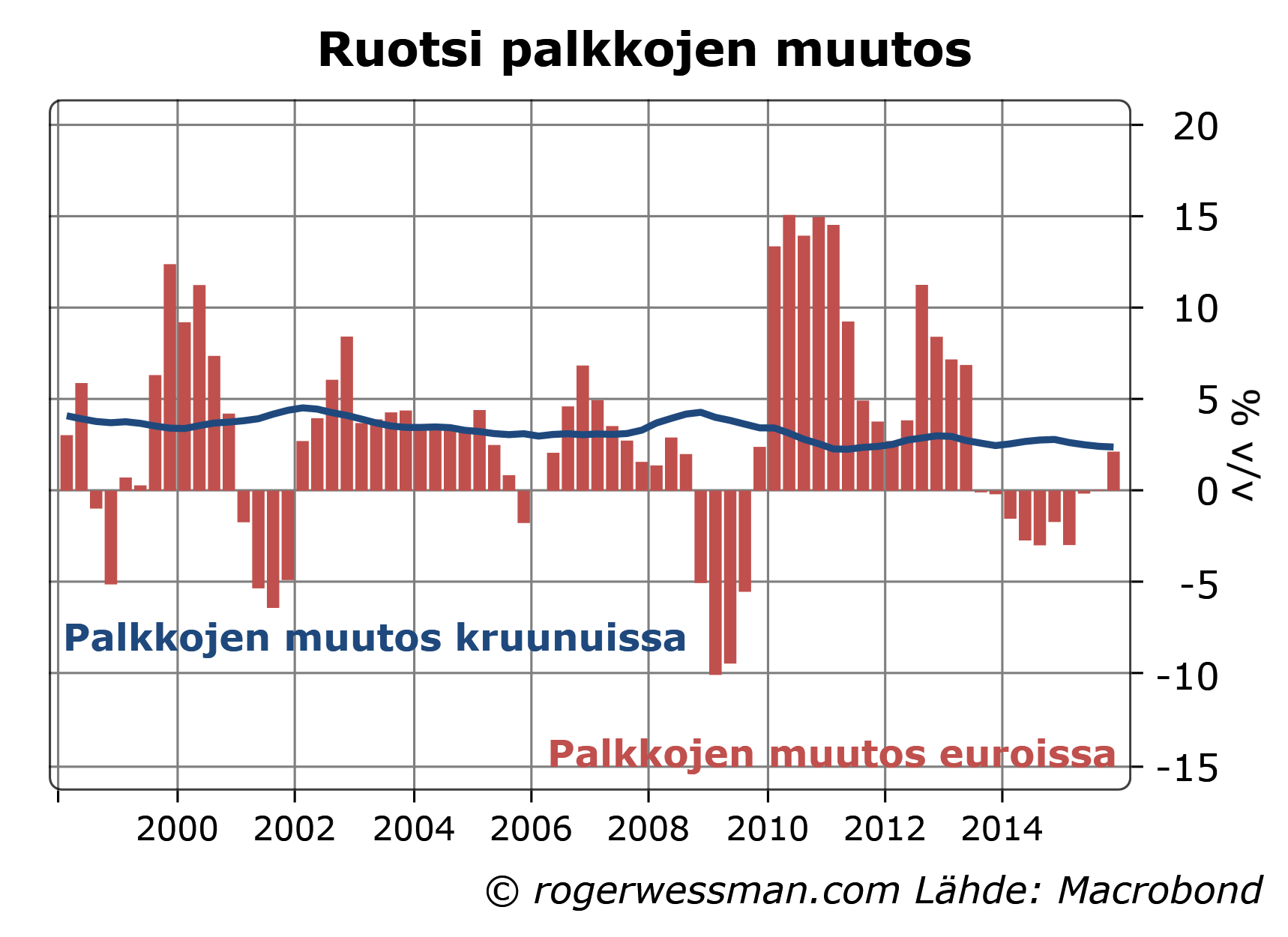 Puheet siitä, että vientialojen palkanmaksuvara määrää palkankorotuksia Ruotsissa ovat ristiriidassa sen kanssa, että palkkojen nousu on seurannut tiiviisti koko talouden työttömyyttä. On vaikea nähdä miten palkankorotuksia edes voitaisiin mitoittaa vientiteollisuuden tarpeiden mukaan, kun maalla on kelluva valuutta. Kruunun liikkeet vaikuttavat paljon enemmän vientiyritysten kilpailukykyyn kuin palkkojen muutokset. Kun maailmantalous romahti 2009 palkat laskivat euroissa laskettuna kymmenen prosenttia – ja palautuvat seuraavana vuonna 15 prosentin nousuun.