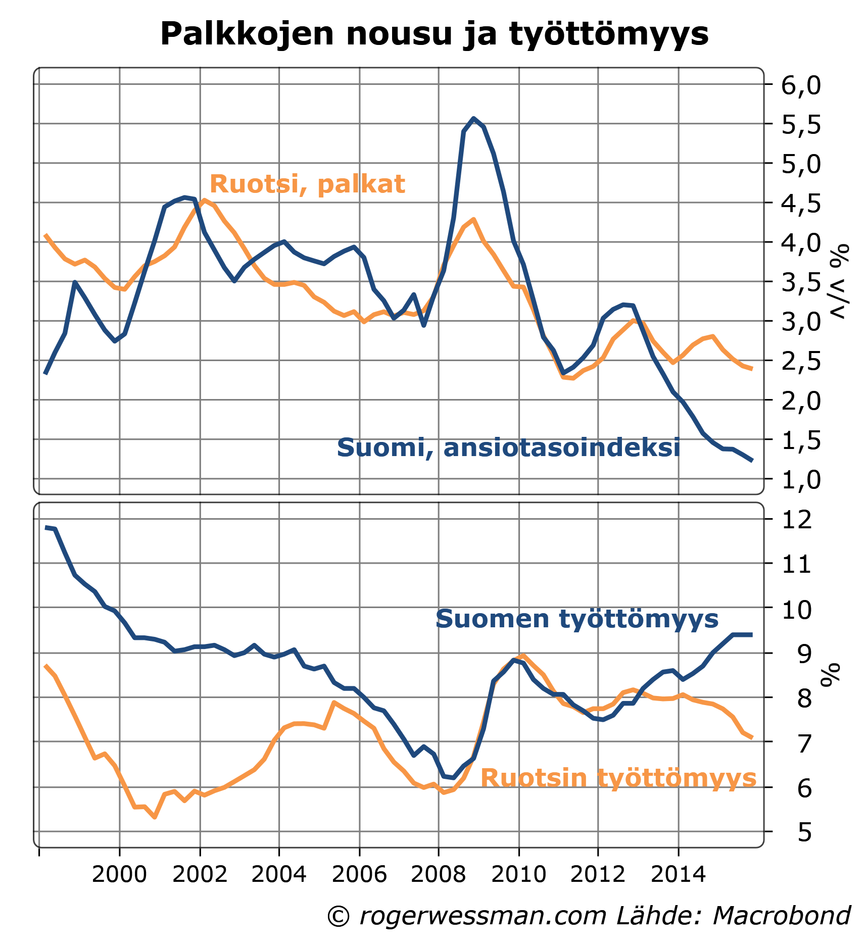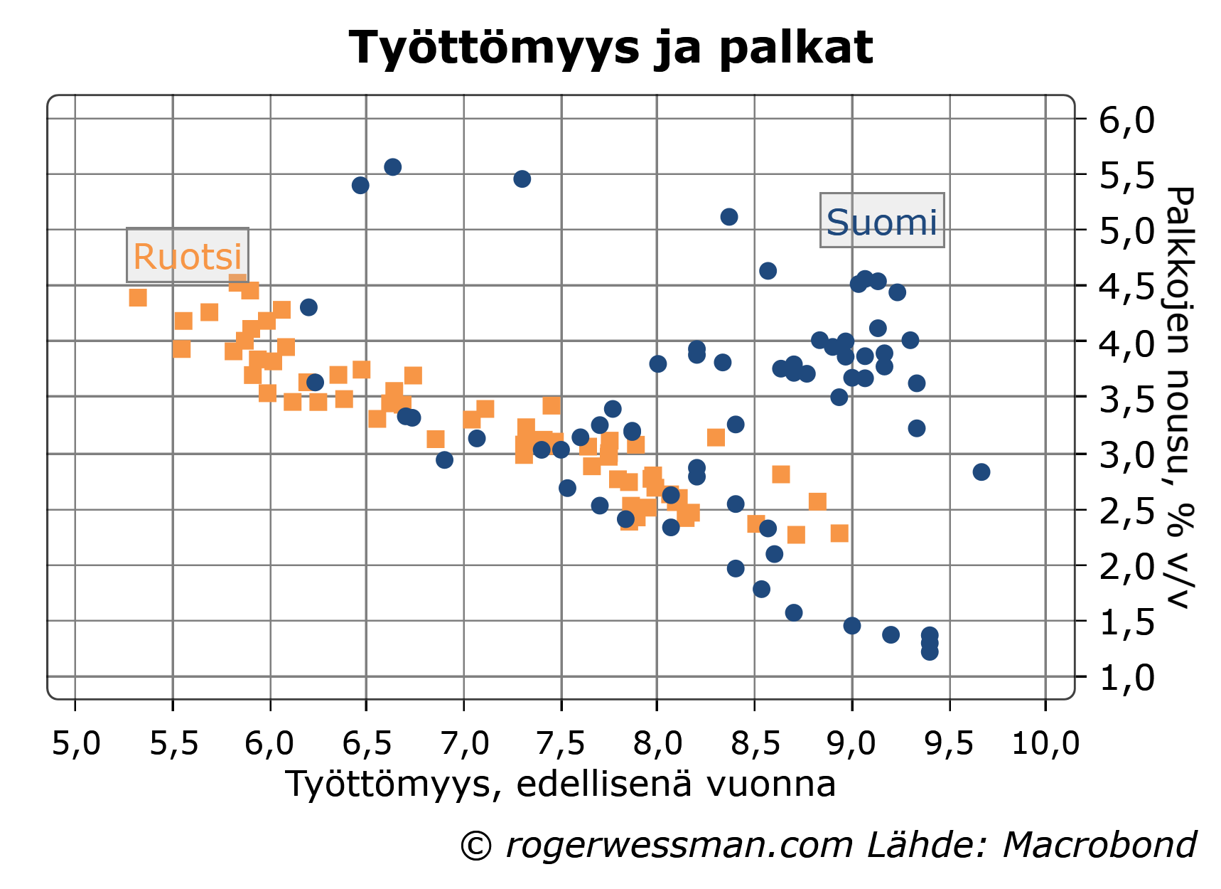 Ruotsi ansaitsee siten Suomea paremman arvosanan johdonmukaisessa palkkojen muodostuksessa. Molemmissa maissa kuitenkin palkkojen nousu näyttää kiihtyvän, kun työttömyys lähestyy kuutta prosenttia. Työttömyyttä on siten vaikeata painaa alle tämän tason. Ruotsissa ei edes suhteellisen korkeilla työttömyysluvuilla olla saatu palkkojen nousua putoamaan alle kahden prosentin, missä Suomessa viime vuoden aikana on onnistuttu.