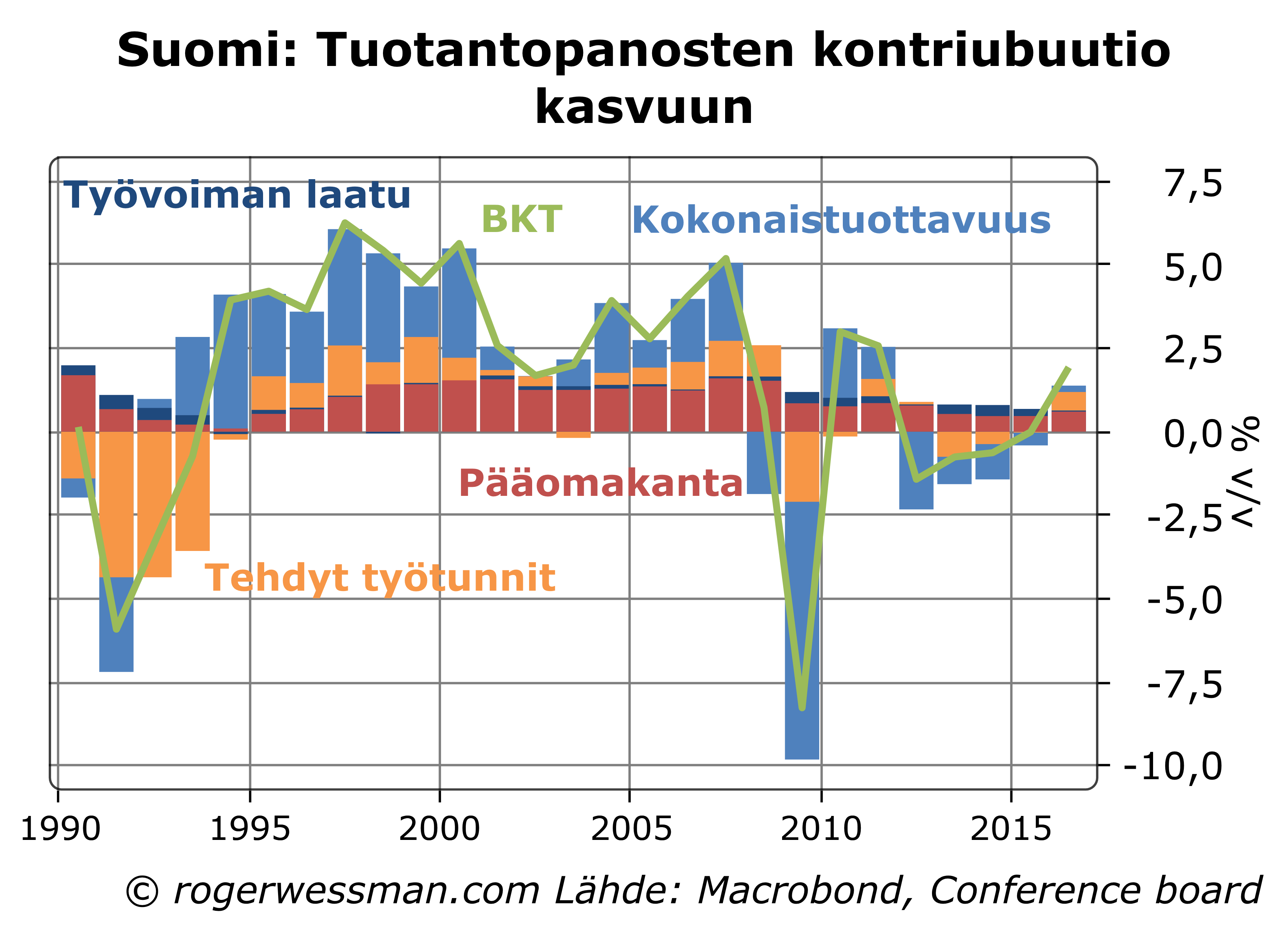 Tuottavuuden kasvu ja suhdanteet » Suomi Tuotantopanosten kontribuutio kasvuun